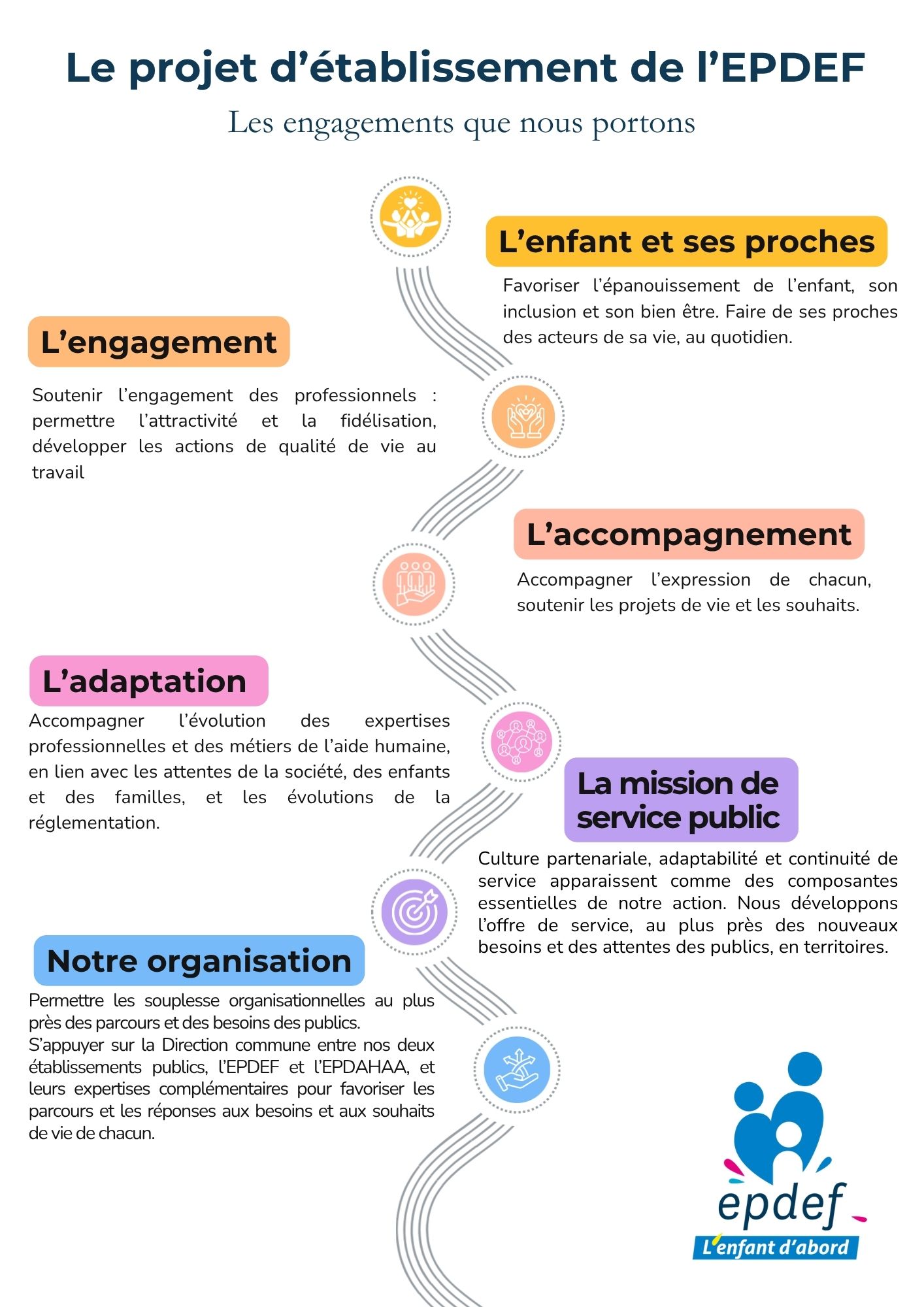 Au plan méthodologique, l’élaboration de ce projet s’est opérée via une large participation des différentes parties prenantes de l’établissement (membres du conseil d’administration, professionnels de l’EPDEF, principaux partenaires et représentants du personnel).